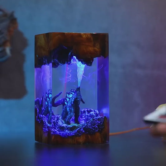Unique Godzilla Gift - Handcrafted Resin & Wood Lamp with Glowing Atomic Blast