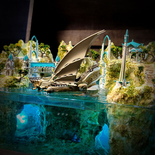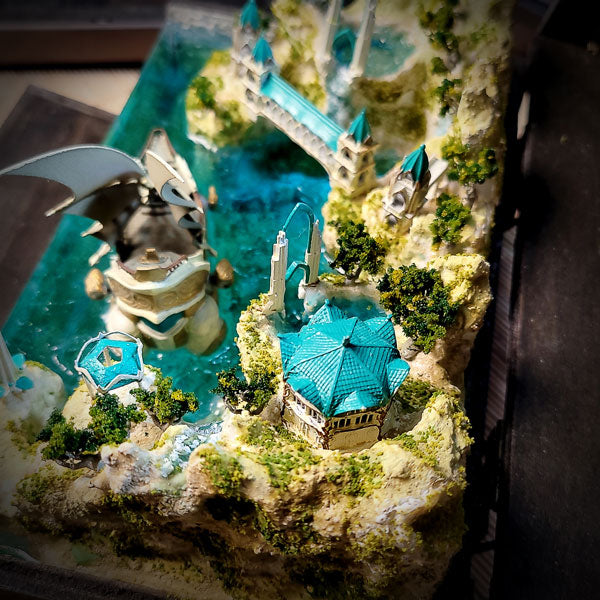 Bring the ethereal beauty of the Undying Lands to your home with this handcrafted "Journey to Valinor" light box. This stunning diorama captures the magic of the Elven haven, featuring: