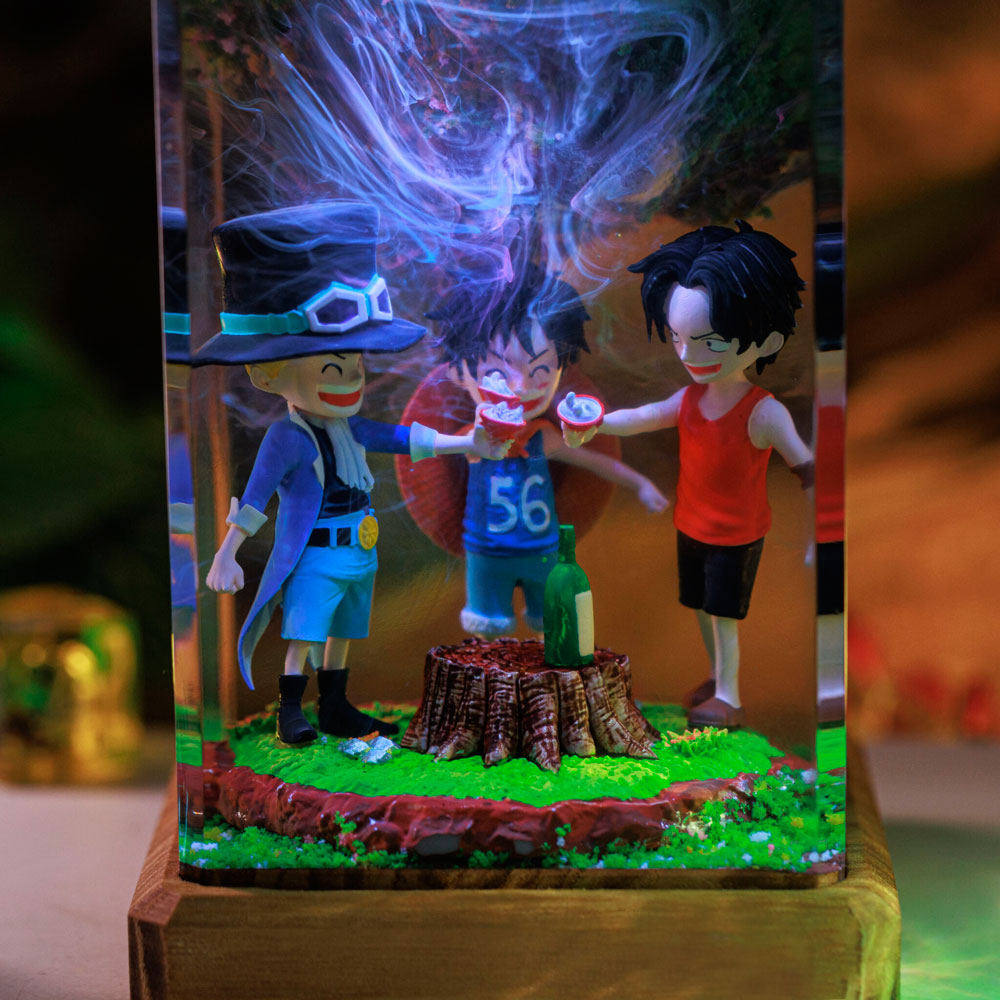 Capture the unbreakable bond of the Straw Hat Crew with this heartwarming One Piece resin lamp! Relive the camaraderie and adventure as Luffy, Zoro, and Sabo share a toast, immortalized in a meticulously crafted scene encased in crystal-clear resin. Illuminated with vibrant, color-changing LEDs, this lamp radiates the spirit of friendship and adventure that lies at the heart of One Piece.