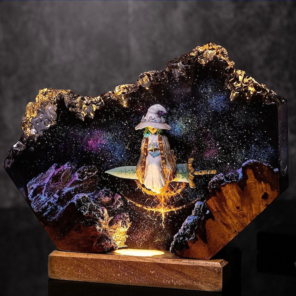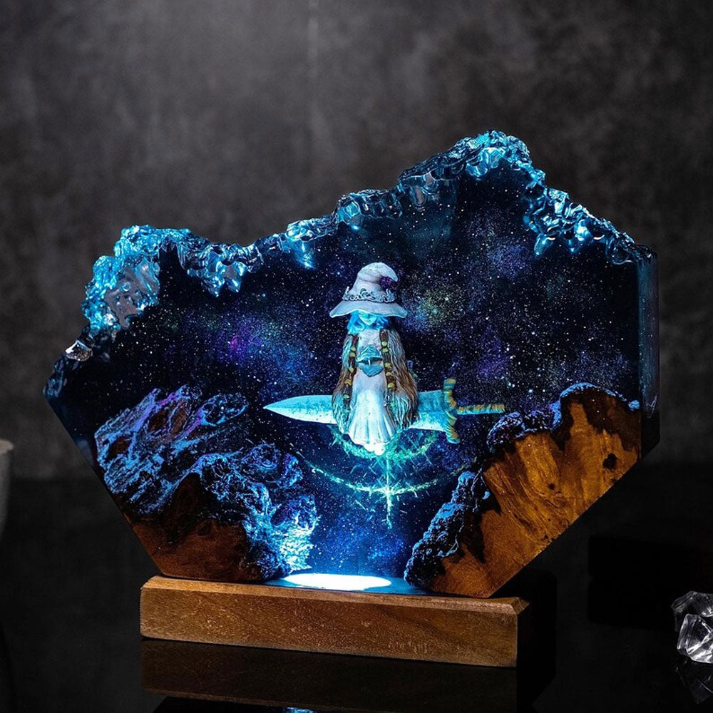 This unique piece features a meticulously crafted miniature of Ranni, the beloved character from Elden Ring, perched upon her iconic blade amidst a swirling, luminous galaxy. Crafted with high-quality resin and natural wood, every detail is brought to life with vibrant colors and a captivating depth that seems to shimmer under the soft LED glow.