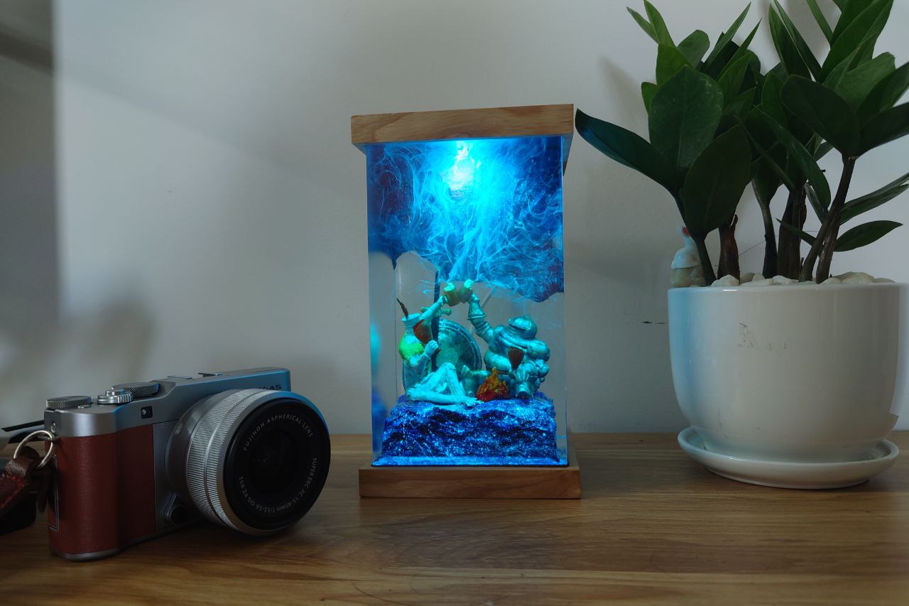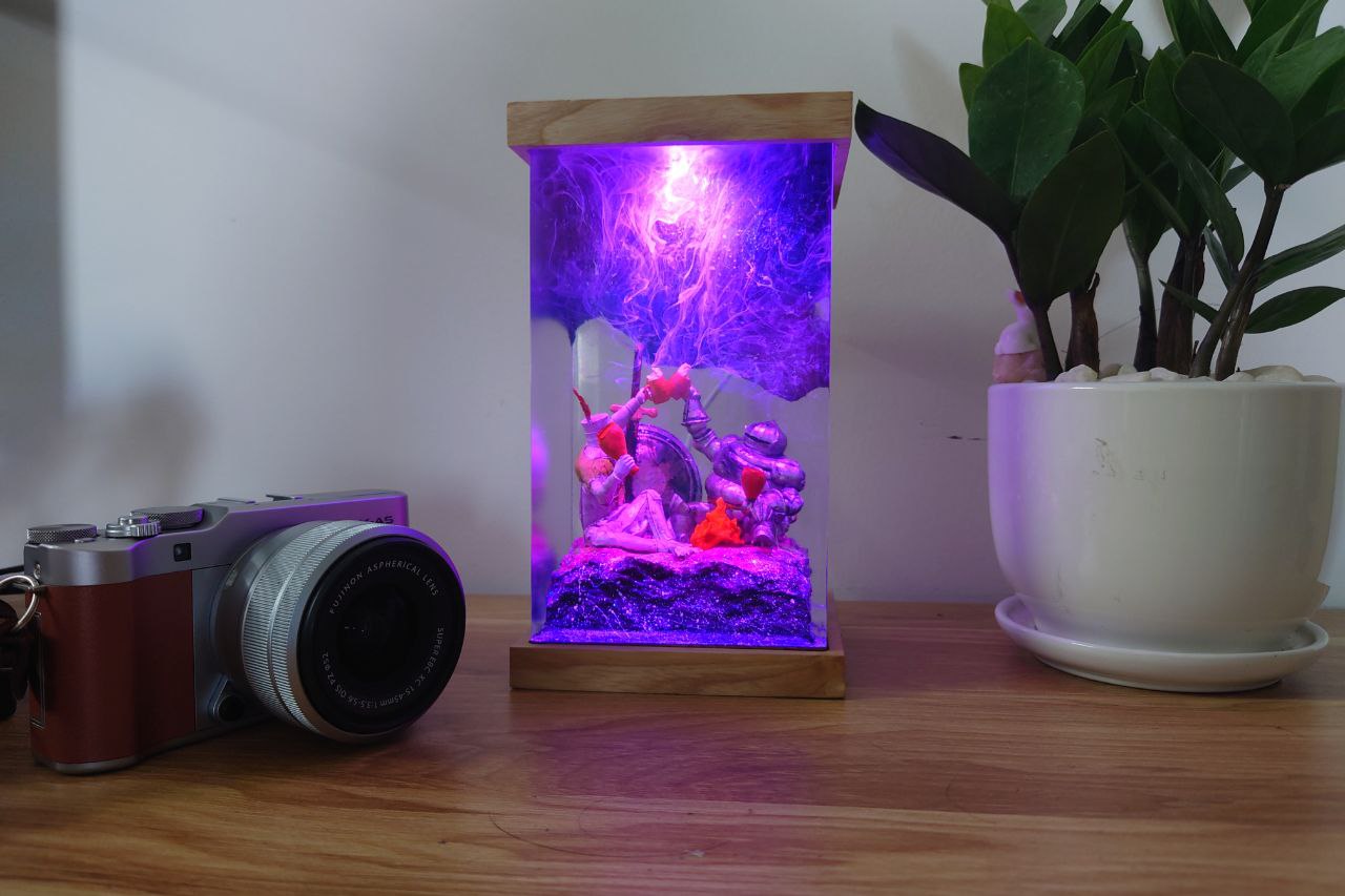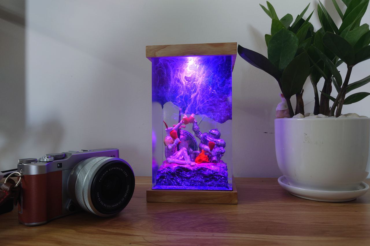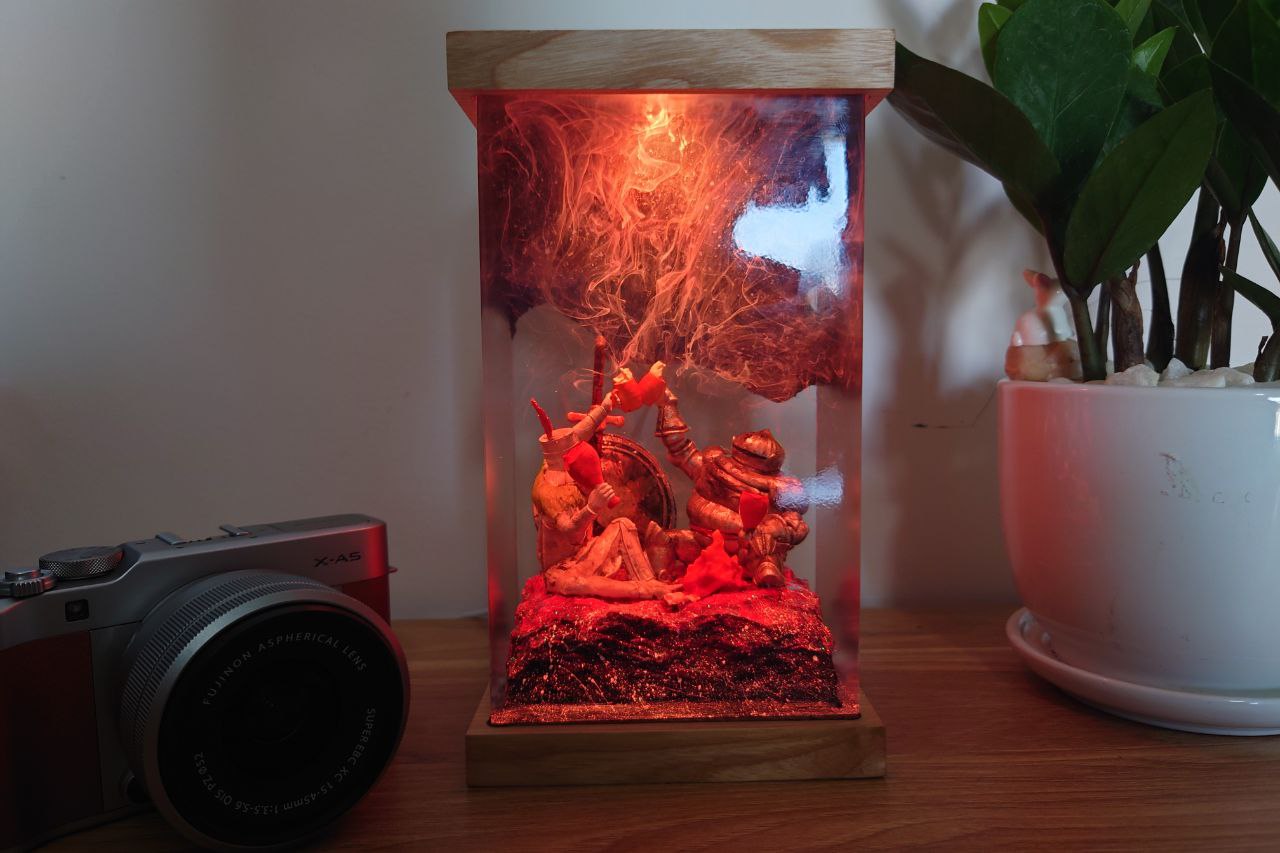Bring the legendary encounter of Solaire and Siegward to life with this stunning, hand-crafted resin lamp! Perfect for any Dark Souls fan, this unique lamp captures the epic battle against the Chaos Demon in a mesmerizing display of light and color.
