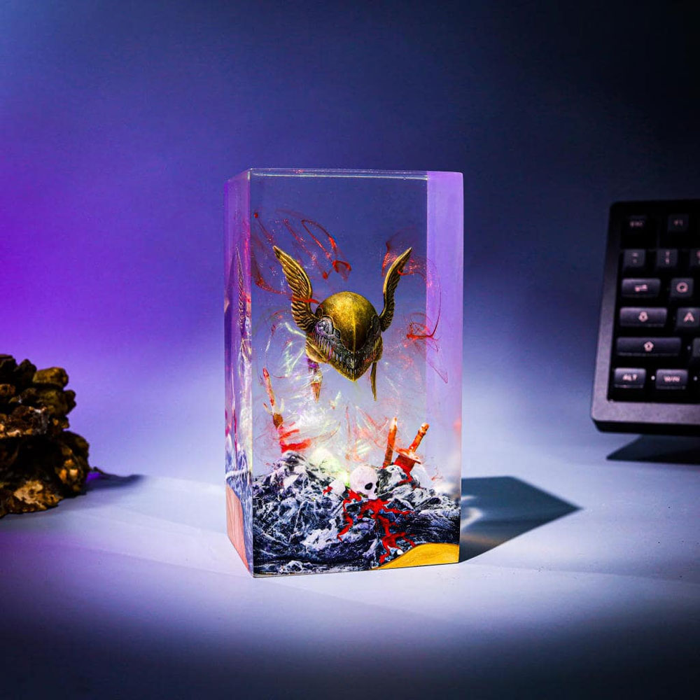 Capture the tragic beauty and terrible power of Malenia, Blade of Miquella, with this hauntingly evocative resin lamp. Encased within crystal-clear resin, a meticulously crafted replica of Malenia's iconic winged helm rests amidst a desolate, ethereal landscape. Watch as the color-changing LED lights illuminate the scene, casting a haunting glow reminiscent of the Scarlet Rot's bloom.