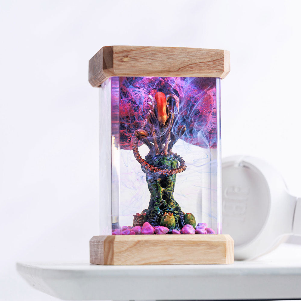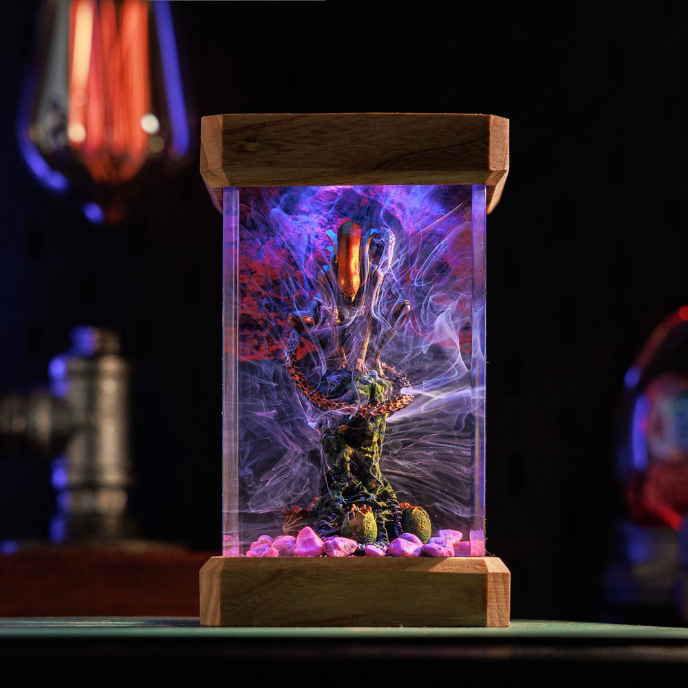 Add an eerie glow to your space with this handcrafted Xenomorph-inspired resin lamp. Featuring a meticulously detailed Xenomorph encased in crystal-clear resin, this unique piece captures the chilling essence of the iconic creature.